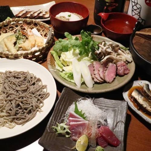 はもの天ぷら、だし巻き、蕎麦味噌きゅうり、蕎麦の実とろろ、穴子天。